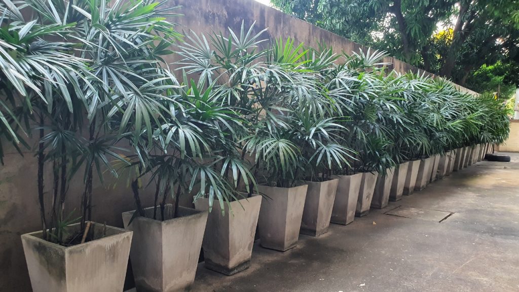 A palmeira-ráfia traz um ar sofisticado para qualquer ambiente, especialmente em espaços amplos sendo uma ótima opção para plantas de apartamento.