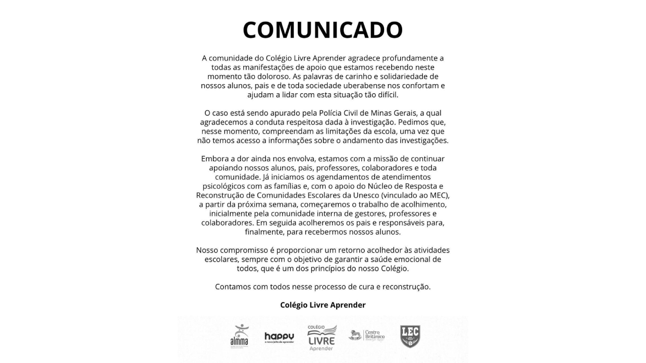 O caso está sendo apurado pela Polícia Civil de Minas Gerais, à qual agradecemos a conduta respeitosa dada à investigação. Pedimos que, nesse momento, compreendam as limitações da escola, uma vez que não temos acesso a informações sobre o andamento das investigações.