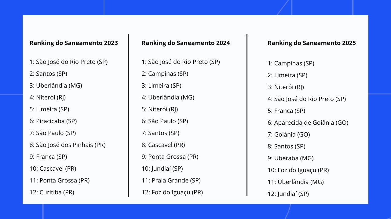 O estudo do Instituto Trata Brasil é feito anualmente desde 2009 com base em dados do Sistema Nacional de Informações em Saneamento Básico (SNIS). Os números de 2025 consideram o ano-base 2023, último divulgado pelo Ministério das Cidades. Campinas (SP) ocupa o primeiro lugar geral do ranking neste ano.