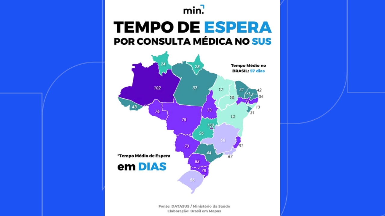 O Sistema Único de Saúde (SUS) enfrenta um de seus maiores desafios no Brasil, o elevado tempo de espera para consultas médicas. Em Minas Gerais, a situação não é diferente. Segundo dados do Departamento de Informação e Informática do Sistema Único de Saúde (DataSUS), ,o tempo de espera por uma consulta médica geral é de 66 dias e, para consultas especializadas, ultrapassa 80 dias. A média no Brasil é de 57 dias, mas existe casos extremos como em Brasília e Amazônia, onde a espera é de 150 e 102 dias, respectivamente. Veja no mapa abaixo: