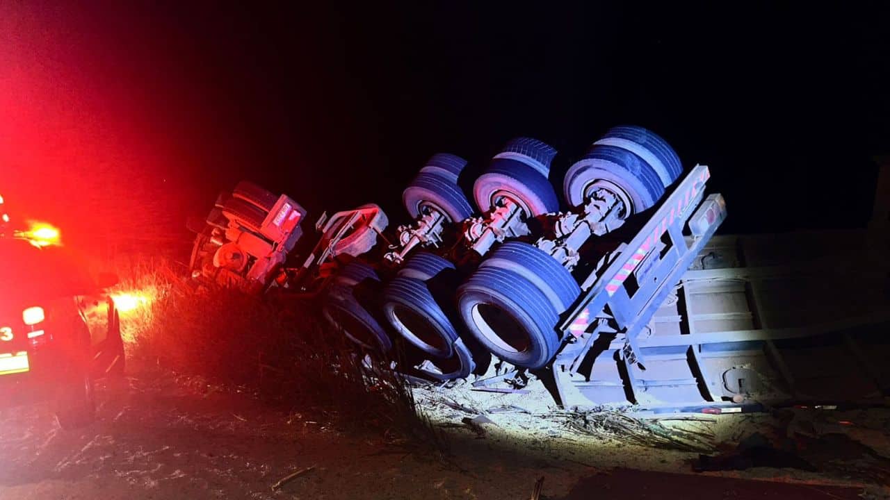 Motorista fica ferido após carreta carregada tombar na MG-188, em Paracatu